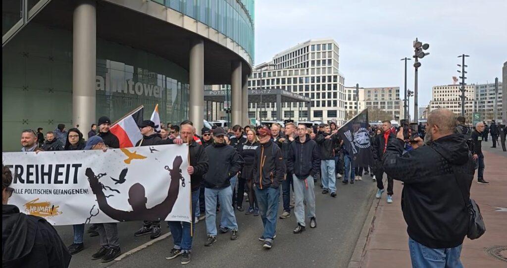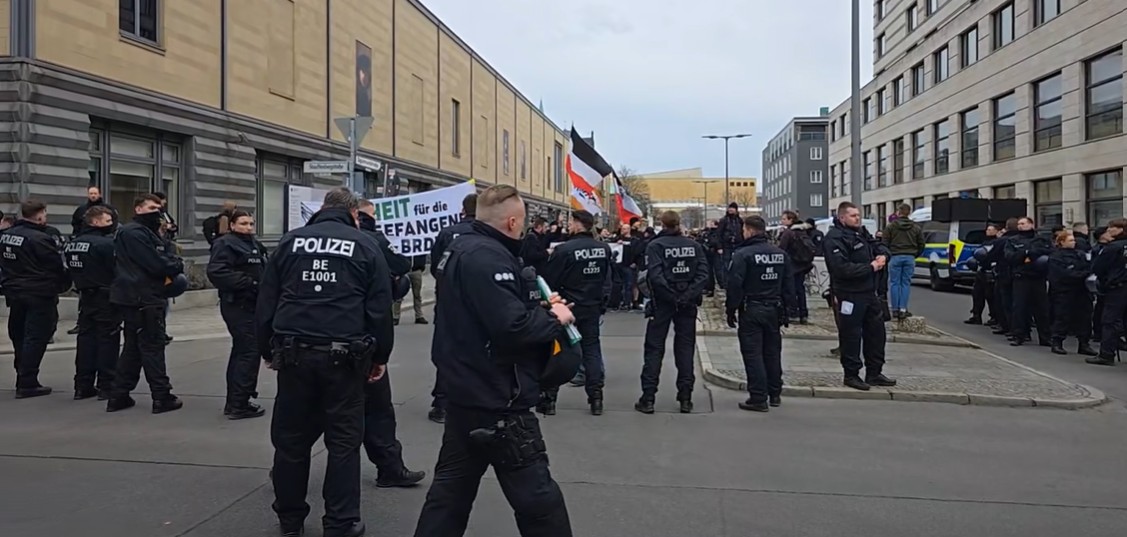 Na Pocdamer placu se okupila grupa od oko 80 pripadnika neonacističke scene, predvođena veteranima poput Kristijana Vorha i Tomasa Vulfa. Vorh je decenijama poznat kao ključna figura organizovanog neonacizma u Nemačkoj. Policija je kod ove grupe zaplenila predmete koji su mogli poslužiti kao “zaštitno naoružanje”, kao i nalepnice sa zabranjenim parolama.